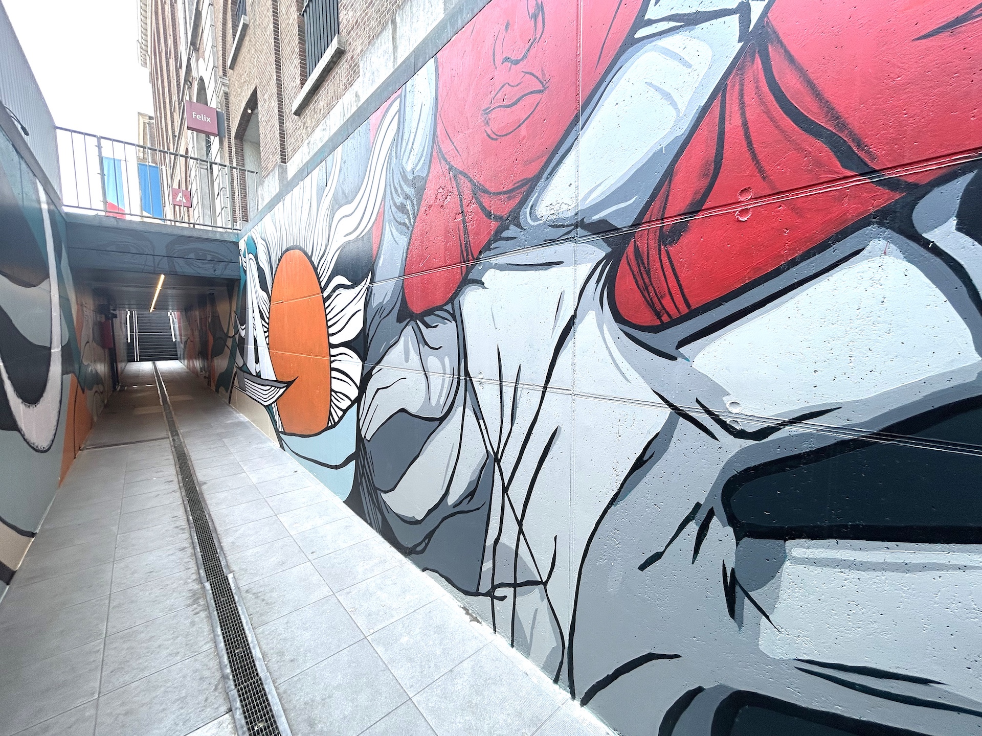 Aan de Godefriduskaai in Antwerpen prijkt sinds kort een indrukwekkende muurschildering die bezoekers verwelkomt aan de voetgangersingang van de Q-Park parking nabij het Felix Pakhuis en het MAS.