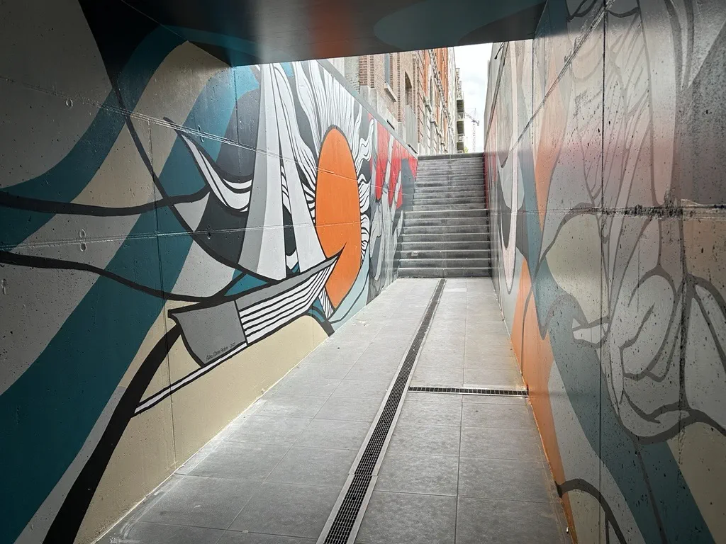 Aan de Godefriduskaai in Antwerpen prijkt sinds kort een indrukwekkende muurschildering die bezoekers verwelkomt aan de voetgangersingang van de Q-Park parking nabij het Felix Pakhuis en het MAS. In samenwerking met het kunstcollectief Treepack realiseerde Q-Park een kunstwerk dat niet alleen een visuele opwaardering vormt van de site, maar ook de kernwaarden van ontmoeting, verbinding en stedelijke integratie weerspiegelt.